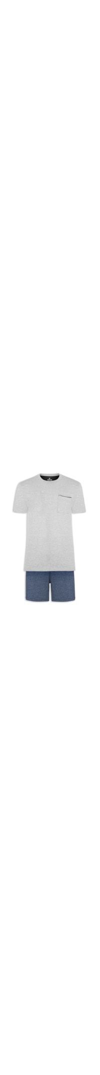 O pijama cinza é confeccionado em malha de algodão com média elasticidade. A camiseta solta ao corpo possui gola redonda com acabamento canelado, mangas curtas e bolso frontal com detalhe de viés em tom contrastante. O short solto ao corpo possui cintura média, cós com elástico embutido e comprimento curto.