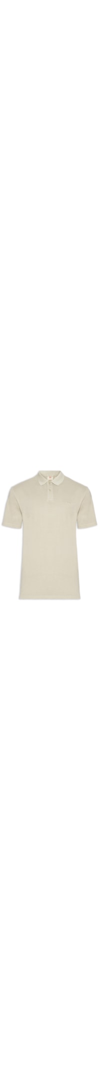 A polo bege é confeccionada em malha de algodão sem elasticidade. A peça solta ao corpo possui gola esporte com botões aplicados e acabamento canelado, mangas curtas, fendas laterais e nome da marca bordado na altura do tórax.