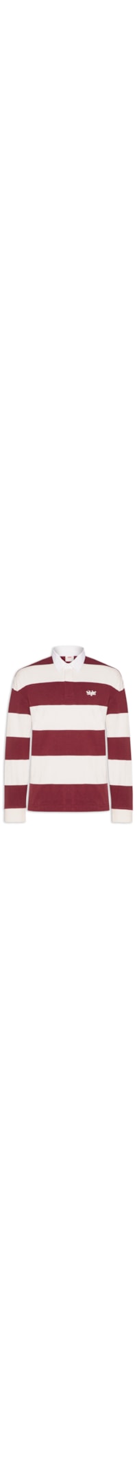 A polo vermelha é confeccionada em malha de algodão sem elasticidade. A peça solta ao corpo possui gola esporte com botões, mangas longas, bordado na altura do tórax e padronagem de listras em cor contrastante.