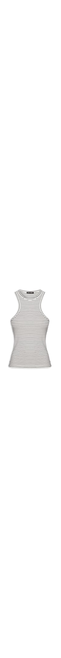 A regata branca é confeccionada em malha leve com alta elasticidade. A peça justa ao corpo possui decote redondo, cavas regulares, decote posterior nadador, padronagem listrada e superfície canelada.