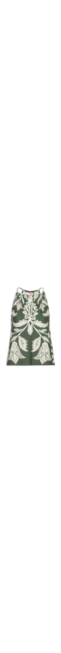 A regata verde é confeccionada em tecido leve com toque de linho sem elasticidade. A peça solta ao corpo possui decote halter, alças finas alongadas, cavas alongadas, recorte vazado na altura do busto, decote posterior nadador, estampa figurativa em cor contrastante e fechamento frontal por amarração.