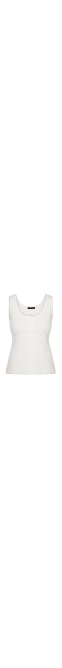 A regata off white é confeccionada em tricot canelado com alta elasticidade. A peça justa ao corpo possui decote em U, alças finas, cavas regulares e fechamento frontal por botões na altura do decote.