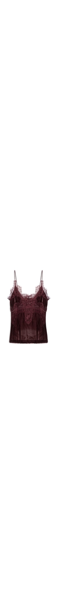 A regata roxa é confeccionada em veludo com toque de seda sem elasticidade. A peça solta ao corpo possui decote em V com aplicação de renda, alças finas, ombros à mostra, caimento fluido, recorte frontal com sobreposição de renda e transparência localizada, acabamento em renda na parte posterior e barra com acabamento simples.