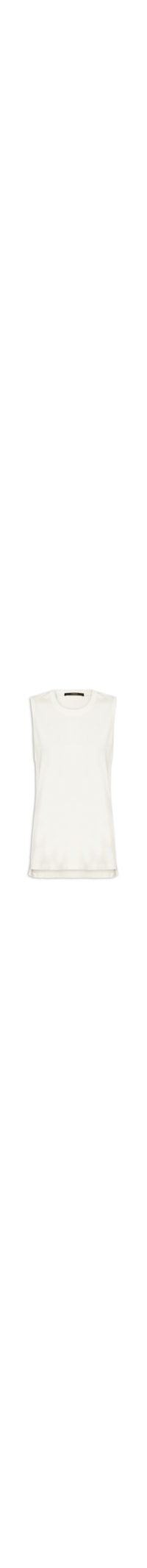 A regata branca é confeccionada em malha de algodão com alta elasticidade. A peça solta ao corpo possui decote arredondado com acabamento canelado, alças largas, cavas alongadas, fendas laterais, barra mullet* e comprimento alongado.