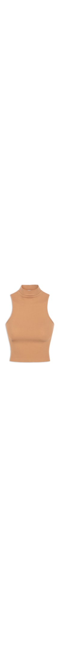 A regata bege é confeccionado em malha canelada com alta elasticidade. A peça justa ao corpo possui gola alta, alças largas e comprimento cropped*.