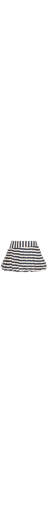 A saia bege é confeccionada em tecido leve sem elasticidade. A peça solta ao corpo possui cintura alta, cós amplo, recorte na altura do quadril com franzidos, padronagem listrada na cor azul marinho, comprimento curto, forro e fechamento lateral por zíper invisível.