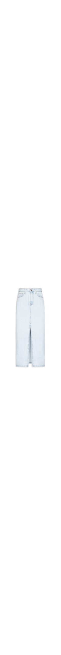 A saia azul é confeccionada em sarja com lavagem jeans sem elasticidade. A peça solta ao corpo possui cintura alta, cós com passantes aplicados, five pockets*, recortes na parte posterior, fenda frontal, efeito estonado, comprimento midi e fechamento frontal por botão e zíper.