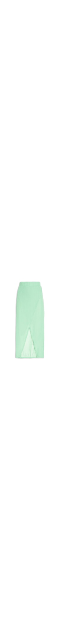A saia verde é confeccionado em malha canelada. A peça possui cintura alta, cós com elástico embutido, meio forro, recorte frontal com fenda, comprimento midi e shape solto.
