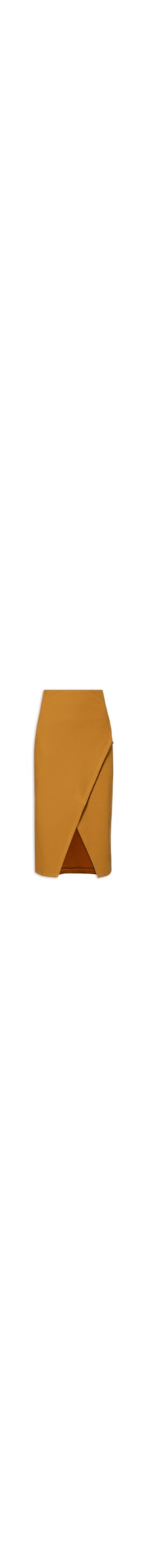 A saia amarela é confeccionada em malha. A peça possui cintura alta, cós com elástico embutido, recorte frontal transpassado com fenda, comprimento midi e shape solto.