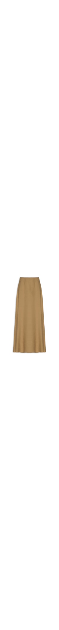 A saia marrom é confeccionada em tecido leve com toque linho sem elasticidade. A peça possui cós alto, caimento evasê ao longo do quadril e comprimento, recorte central posterior, comprimento midi e fechamento posterior por zíper invisível.