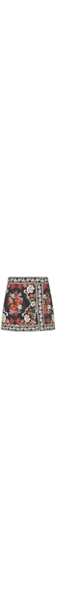 A saiapreta é confeccionada em tecido sem elasticidade. possui comprimento curto e fechamento lateral. A peça possui estampa floral em cores contrastantes.