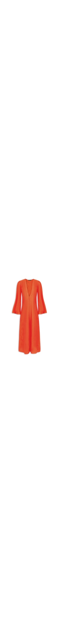 A saida de praia vermelha é confeccionada em tecido leve. A peça solta ao corpo possui decote V profundo, mangas longas amplas, abertura frontal com fechamento por botão e comprimento midi.