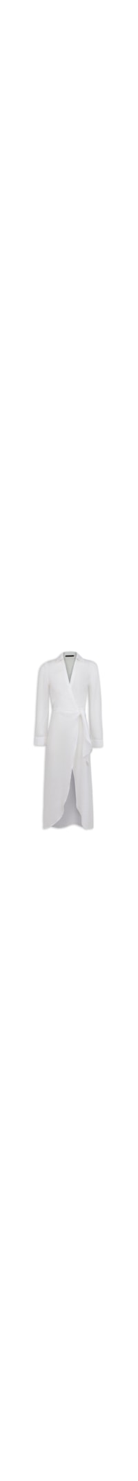 A saida de praia branca é confeccionada em tecido leve sem elasticidade. A peça solta ao corpo possui gola esporte, decote V profundo, mangas longas com ajuste nos punhos, abertura frontal com fechamento por amarração e comprimento longo.