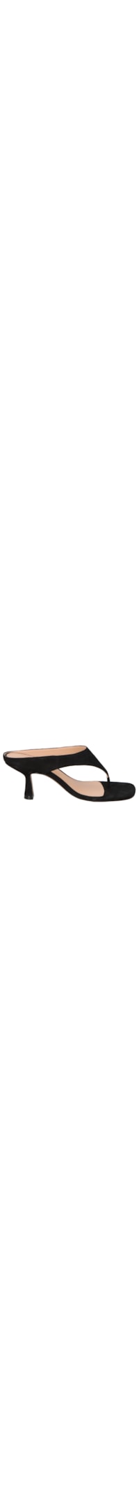 A sandália preta é produzida em camurça. A peça possui bico quadrado, tira larga frontal e aplicação central para o dedo, laterais abertas, palmilha macia com nome da marca timbrado, salto fino médio e solado em laqueado.