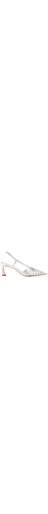 A sandália prata é produzida em couro com superfície metalizada. A peça possui bico fino, tiras finas, palmilha macia com nome da marca na cor preto, salto médio estilizado, solado laqueado e fechamento lateral por fivela regulável.
