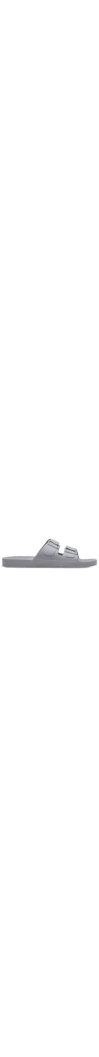 A sandália cinza é produzida em PVC ecológico expandido. A peça possui bico arredondado, tiras médias com detalhe figurativo de fivela em relevo, palmilha texturizada e detalhe do nome da marca em relevo na parte lateral.