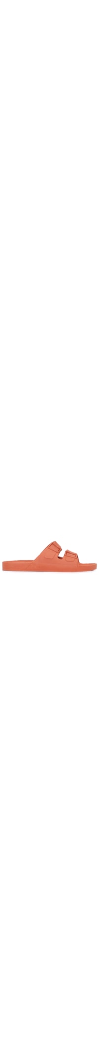 A sandália laranja é produzida em borracha de material reciclável. A peça de modelo flat possui bico arredondado, tiras médias duplas com recorte vazado e detalhe em fivela de mesmo material, palmilha anatômica com superfície texturizada, entressola com nome da marca em relevo e solado emborrachado.