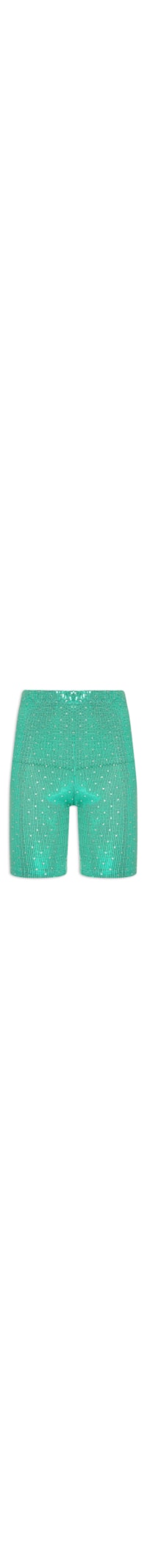 O short verde é confeccionado em malha com superfície em paetê. A peça modelo biker possui cintura alta, cós elástico, shape justo, comprimento curto e acabamento pespontado.