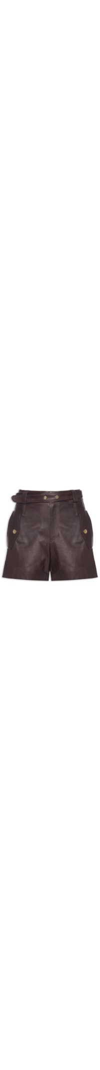 O short marrom é confeccionado em couro. A peça solta ao corpo possui cintura alta, cós com passantes, aplicados, bolsos frontais modelo faca, bolsos posteriores embutidos, recortes frontais na altura do bolso com detalhe em aviamento metalizado, comprimento curto e fechamento por botão e zíper. Acompanha cinto de mesmo material e cor para uso opcional.