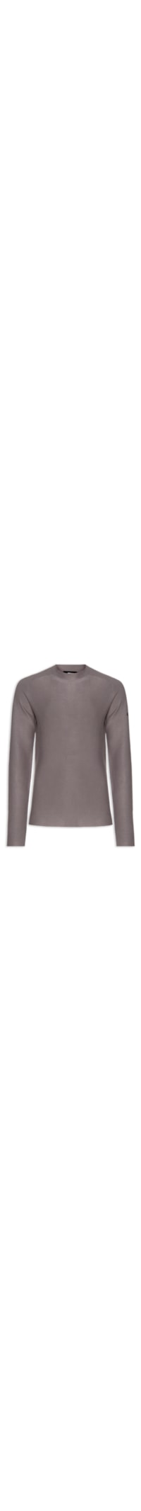 O suéter cinza é confeccionado em tricot com baixa elasticidade. A peça solta ao corpo possui gola careca, mangas longas com ajuste nos punhos e acabamento canelado na gola, nas mangas e na barra.