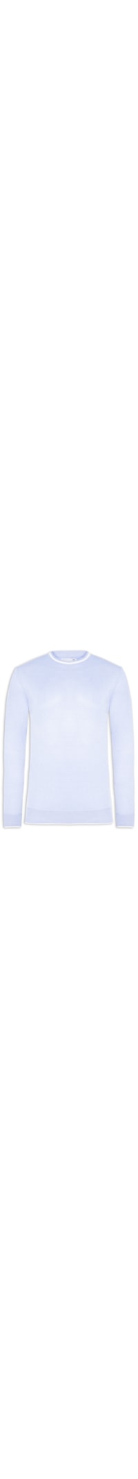 O suéter azul é confeccionado em tricot com baixa elasticidade. A peça solta ao corpo possui gola careca, mangas longas com punho, detalhe em cor contrastante e acabamento canelado na gola, punhos e barra.