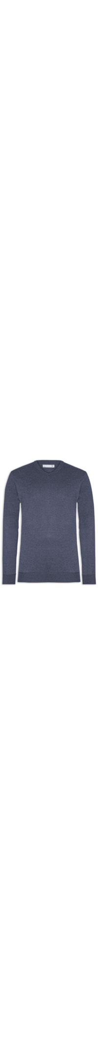 O suéter azul é confeccionado em tricot com baixa elasticidade. A peça solta ao corpo possui gola V, mangas longas com punho e acabamento canelado na gola, punhos e barra.