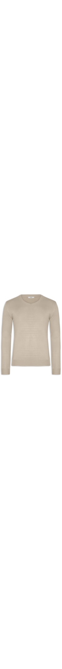 O suéter bege é confeccionado em tricot com alta elasticidade. A peça justa ao corpo possui gola V e mangas longas com ajuste nos punhos.