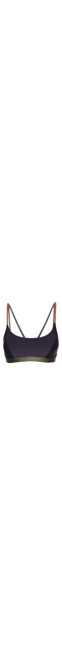 O top azul marinho é confeccionado em malha de poliamida com alta elasticidade. A peça justa ao corpo possui decote frontal reto e posterior nadador, alças finas duplas cruzadas na parte posterior e em cores contrastantes, recorte frontal, tag da marca aplicada em borracha vermelha na parte posterior, recortes, bojo removível, elástico embutido na barra e em cor contrastante verde, forro e comprimento cropped*.