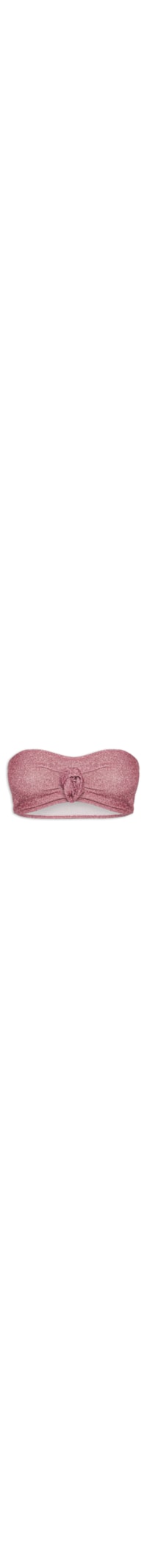 O top rosa é confeccionado em malha leve com fios de lurex aplicados e com média elasticidade. A peça justa ao corpo de modelo tomara que caia, possui decote reto, franzido frontal com aplicação de flor e elástico embutido nas partes superior e inferior.