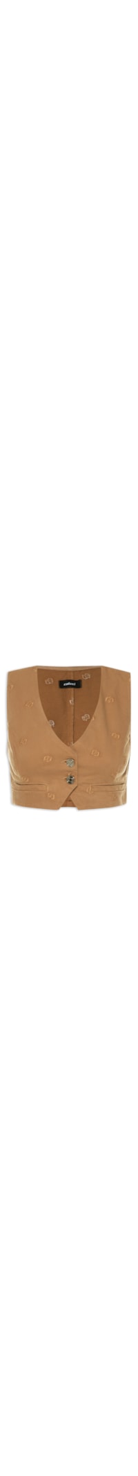 O top marrom é confeccionado em sarja. a peça possui decote V, alças largas, recortes frontais, bolso faca decorativo, bordado com logo da marca, recorte posterior, tag com nome da marca aplicado na região posterior, comprimento cropped*, shape justo e fechamento frontal por botões.