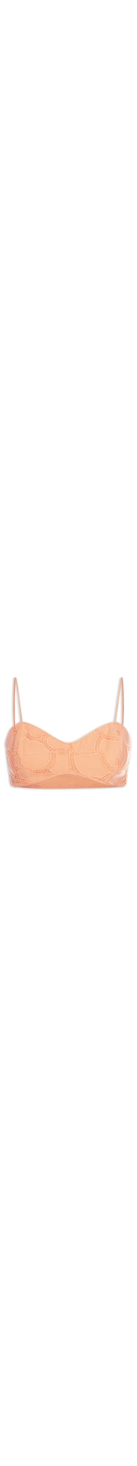 O top laranja é confeccionado em laise. A peça possui decote frontal coração e posterior reto, alças finas reguláveis por amarração posterior, cavas regulares, forro, recortes na altura do busto, comprimento cropped*, shape justo e fechamento lateral por zíper invisível.