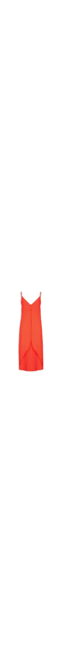 A túnica vermelha é confeccionada em crepe sem elasticidade. A peça solta ao corpo possui decote V, alças finas reguláveis, fenda frontal, barra mullet* arredondada, comprimento alongado e fechamento frontal em botões.