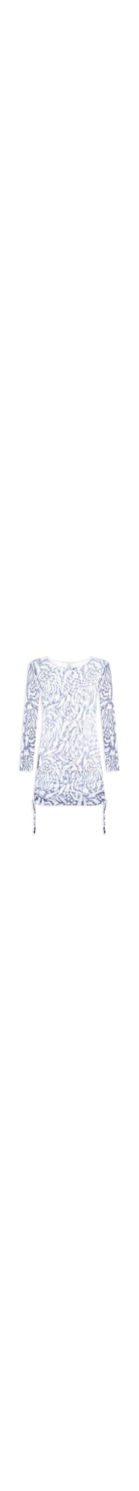 O vestido azul é confeccionado em tule de média elasticidade. A peça justa ao corpo possui decote canoa, mangas longas, ombros regulares, caimento ajustado, estampa abstrata em tons de azul e branco, laterais com franzido regulável por amarração e barra com acabamento simples.