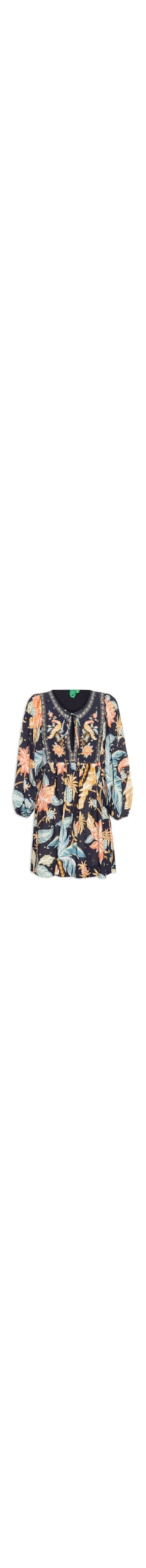 O vestido azul é confeccionado em tecido leve sem elasticidade. A peça solta ao corpo, possui decote em V com cordão para amarração frontal, mangas longas de modelo morcego com franzido nos ombros e elástico embutido nos punhos, franzido na cintura, mix de estampas figurativas em cores contrastantes com detalhes de fios de lurex aplicado, forro superior e comprimento curto.