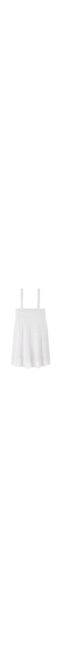 Vestido curto em algodão com alças finas e corte abaixo do seio, adornado com barras. Tem comprimento acima do joelho.