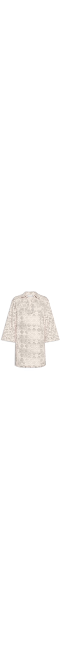 O vestido off white é confeccionado em tecido encorpado sem elasticidade. A peça solta ao corpo possui gola polo com recorte em V, mangas 3/4 amplas, comprimento curto e aplicação de bordado em padronagem de quadrados em cor contrastante.
