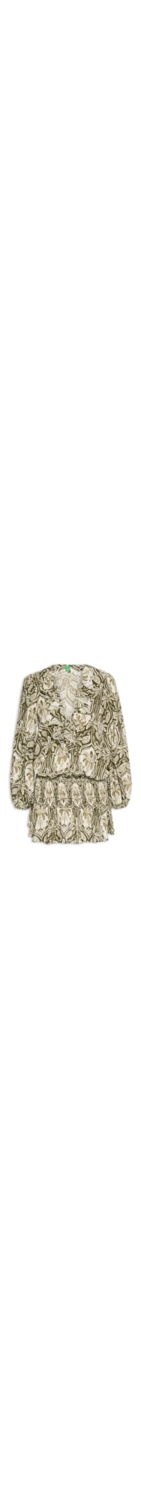 O vestido verde é confeccionado em tecido leve com toque de linho e sem elasticidade. A peça solta ao corpo possui decote V profundo com recorte frontal e fechamento por amarração, mangas longas com elástico embutido nos punhos, tiras alongadas aplicadas na altura do busto para efeito de babados na parte frontal e posterior, aplicação de lastex na cintura, comprimento curto e estampa floral em cores contrastantes.