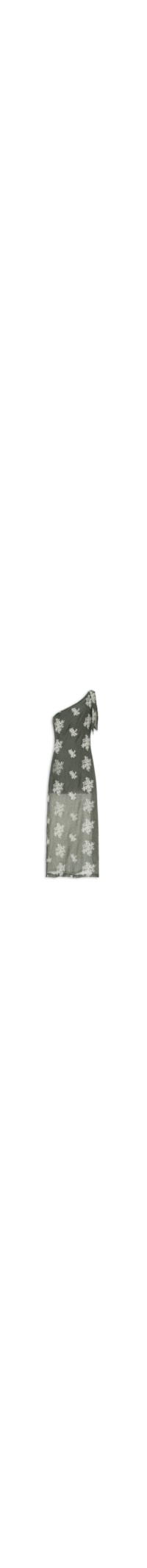 O vestido cinza é confeccionada em tecido leve sem elasticidade. A peça solta ao corpo possui decote ombro único, alça média alongada para amarração superior, cavas regulares, fendas laterais, meio forro, transparência na parte inferior, superfície texturizada, bordados florais em cor contrastantes e comprimento longo.