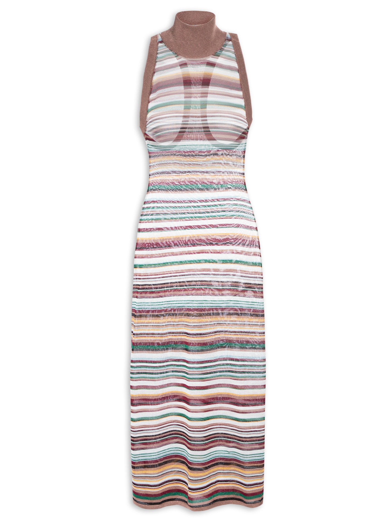 O vestido marrom é confeccionado em tricot com alta elasticidade. A peça justa ao corpo possui gola alta, cavas estendidas, padronagem listrada em cores contrastantes, leve transparência e comprimento midi.