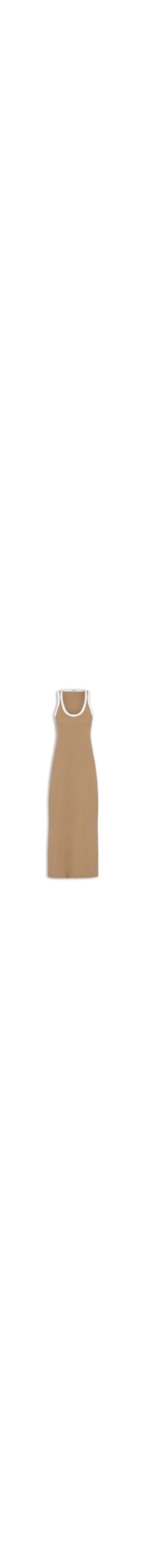 O vestido marrom é confeccionado em malha canelada com alta elasticidade. A peça solta ao corpo possui decote frontal U profundo e posterior nadador, alças médias, cavas estendidas, fendas laterais, acabamento em viés na cor branca no decote e nas cavas e comprimento longo.
