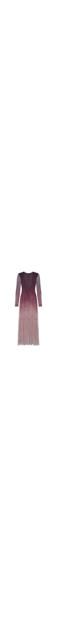 O vestido feminino confeccionado em tule leve com transparência e efeito degradê. O modelo possui comprimento longo, caimento fluido e mangas longas em tule, decote fechado na frente e decote profundo nas costas, com amarração delicada e detalhe de pingente metálico, forro e padronagem degradê em cores contrastantes.