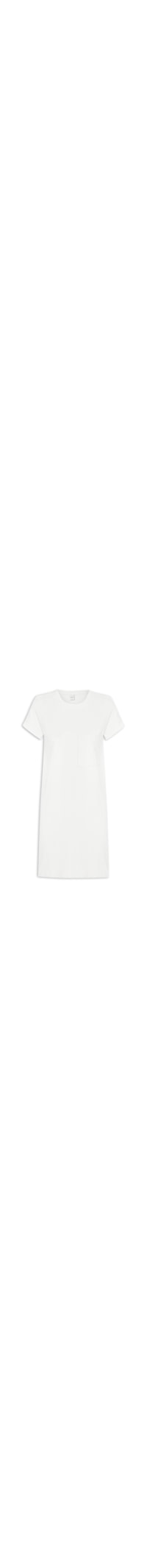 O vestido bege é confeccionado em malha de algodão com superfície texturizada e média elasticidade. A peça solta ao corpo possui decote redondo com acabamento canelado, mangas curtas de modelo japonesa, bolso frontal aplicado na altura do busto e comprimento curto.