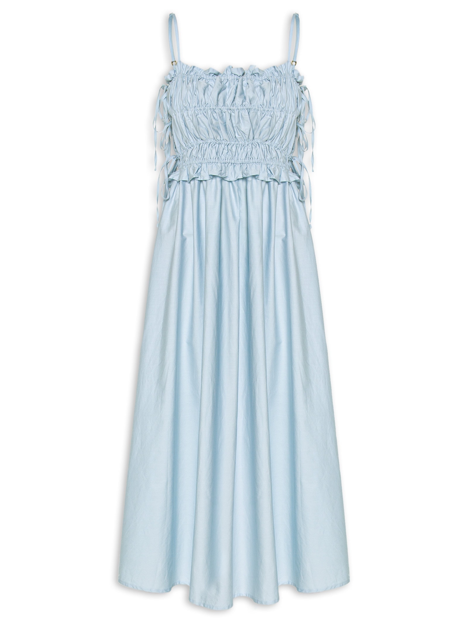 O vestido azul é confeccionado em tecido leve sem elasticidade. A peça justa no busto e solta no corpo possui decote reto, alças finas reguláveis, recortes com tiras embutidas para amarrações laterais na altura do busto, babado aplicado na altura da cintura e comprimento midi.