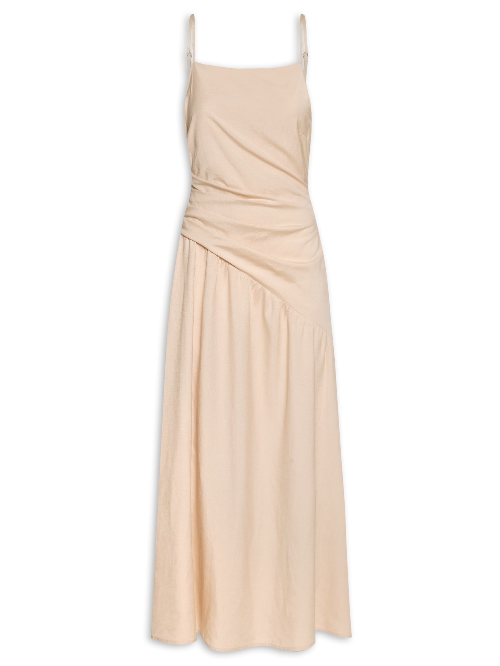 O vestido bege é confeccionado em tecido leve com toque de linho sem elasticidade. A peça solta ao corpo possui decote assimétrico, alças finas com regulagem, pregas na lateral na área da cintura, saia com efeito franzido assimétrico, comprimento midi, forro, e fechamento lateral por zíper invisível.