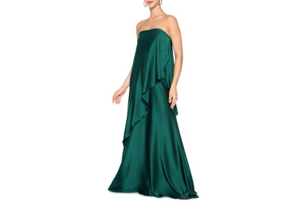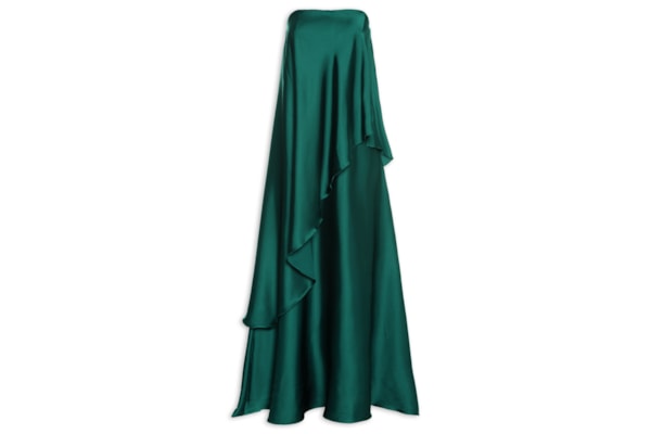 O vestido verde é confeccionado em tecido leve com toque de linho sem elasticidade. A peça solta ao corpo possui decote assimétrico, alças finas com regulagem, pregas na lateral na área da cintura, saia com efeito franzido assimétrico, comprimento midi, forro, e fechamento lateral por zíper invisível.