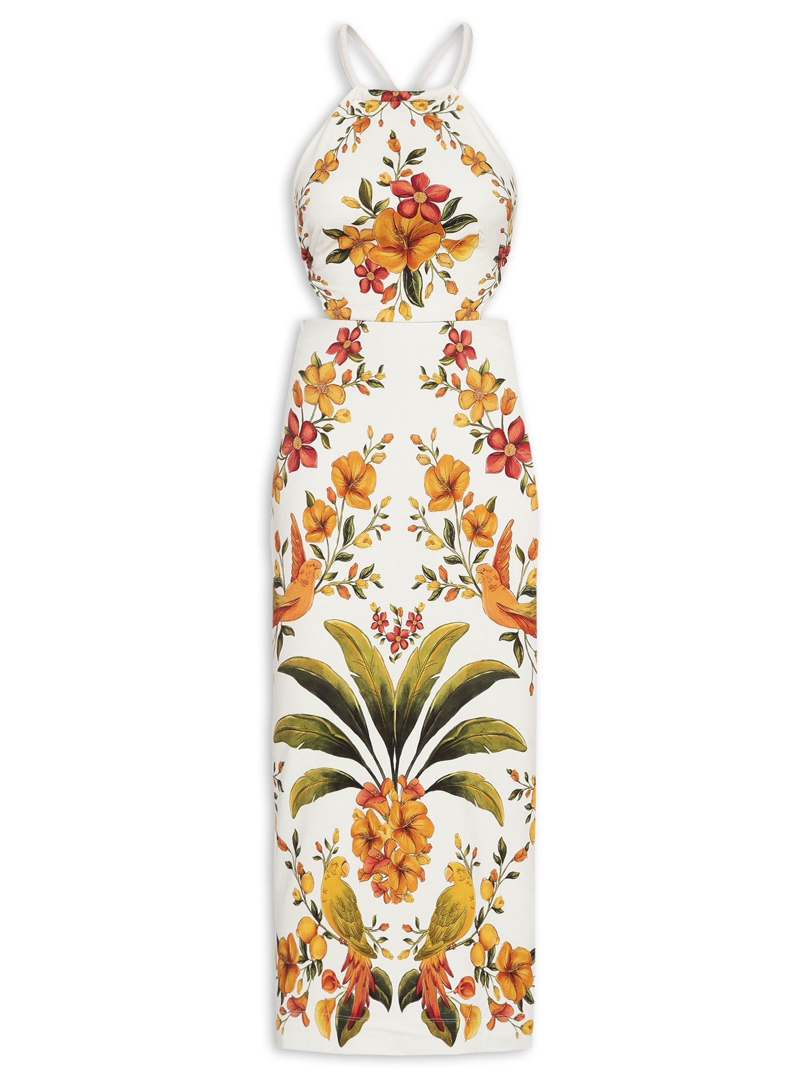 O vestido branco é confeccionado em tecido leve com média elasticidade. A peça de modelo frente única solta ao corpo possui decote trapézio, alças finas entrelaçadas reguláveis por amarração posterior, recortes na cintura, mix de estampas em cores contrastantes e comprimento midi.
