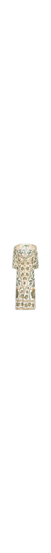 O vestido verde é confeccionada em tecido leve com alta elasticidade. A peça possui decote V com detalhes bordados e cordão estendido para amarração, mangas 7/8, fendas laterais, elástico embutido na cintura posterior, estampas folhagem em cores contrastantes e comprimento midi.