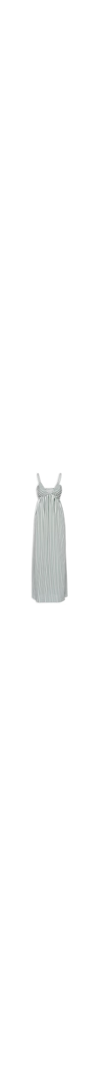 O vestido verde é confeccionado em tecido leve sem elasticidade. A peça solta ao corpo possui decote V, alças finas reguláveis, recorte franzido abaixo do busto, lastex aplicado na parte posterior, padronagem listrada na cor branca, parte superior em tecido duplo e comprimento midi.