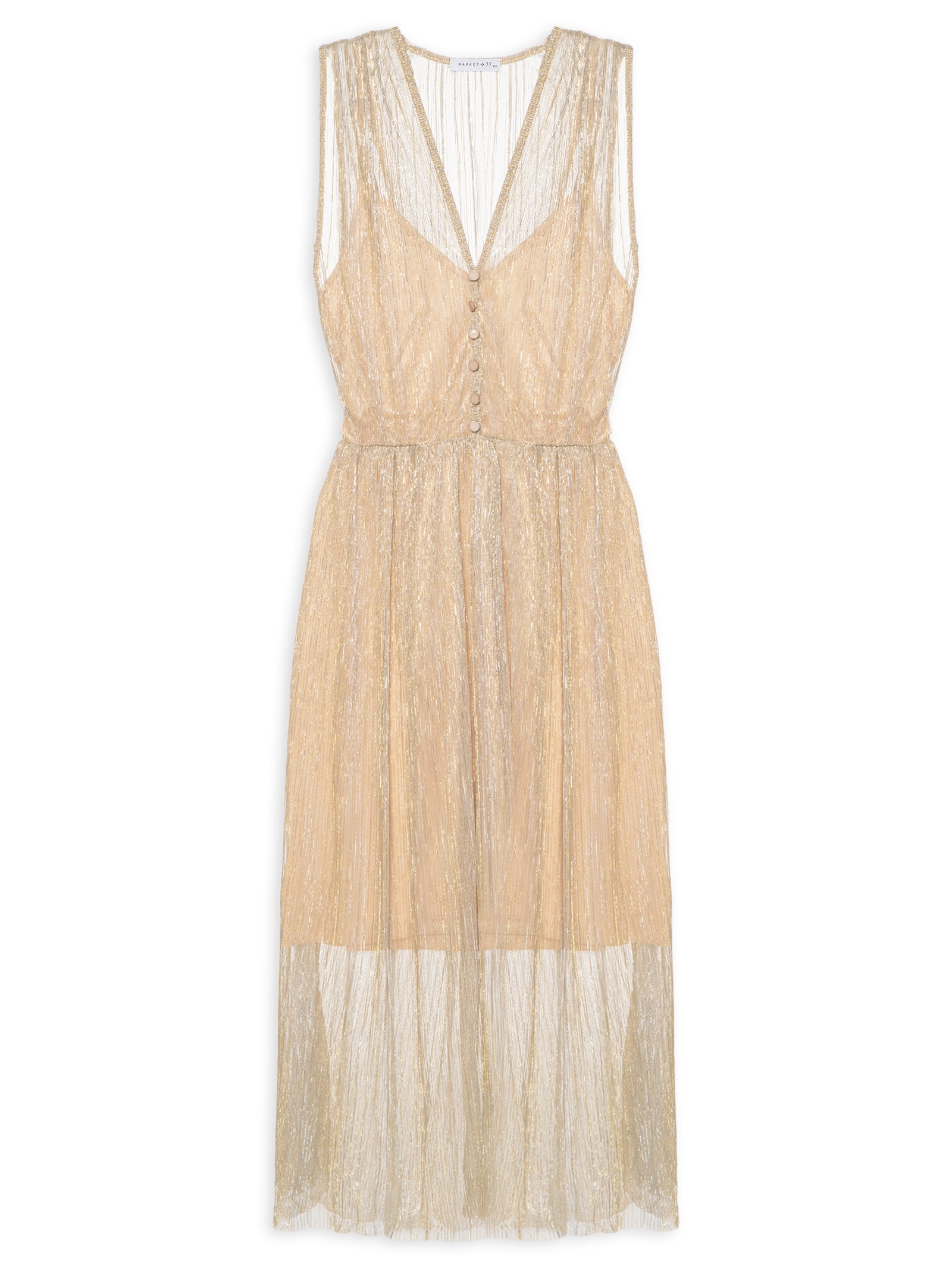 O vestido dourado é confeccionado em tecido leve com fios de luréx e com alta elasticidade. A peça solta no corpo possui decote V, alças largas, superfície em luréx, elástico embutido na cintura, botões decorativos na parte frontal, forro, alta transparência e comprimento midi.