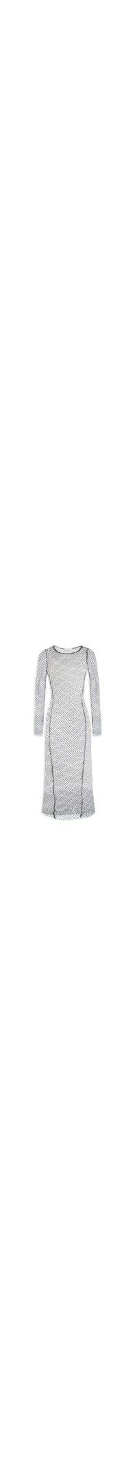 O vestido preto é confeccionado em malha metálica com superfície em strass aplicados de alta elasticidade. A peça justa ao corpo, possui decote redondo, mangas longas, barra arredondada, transparência e comprimento midi.